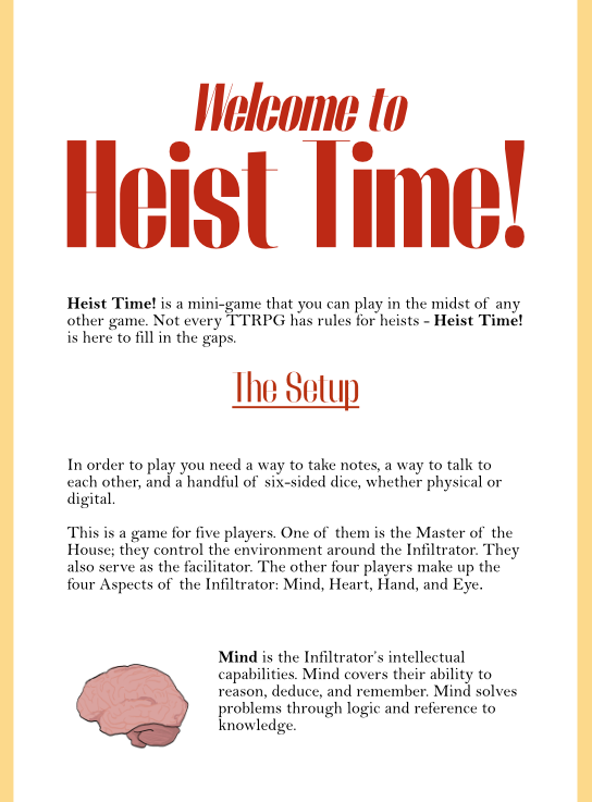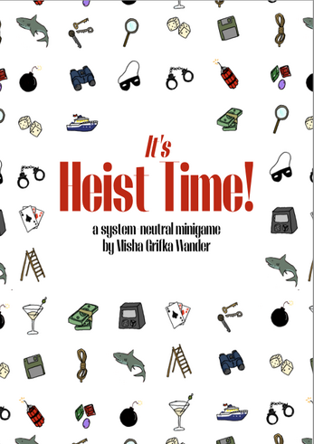 Need to do a heist, but your game doesn't have rules for heisting? No problem! Heist Time! is a minigame for up to five people, suitable for going after any kind of goal that's being kept away from you, whether that's a person, a magic item, a valuable piece of information, or some other treasure.